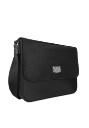 A Nylon messenger bag with zipper and embellished with an embossed gel print logo.