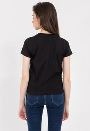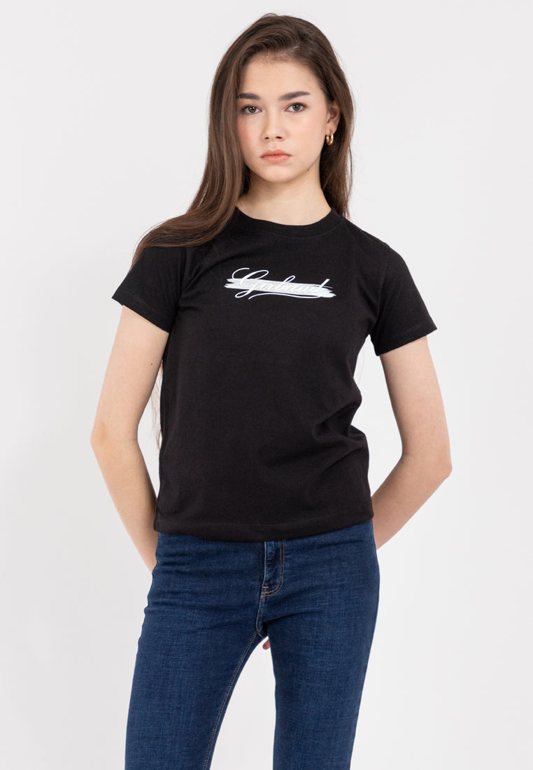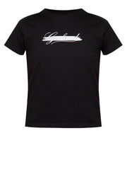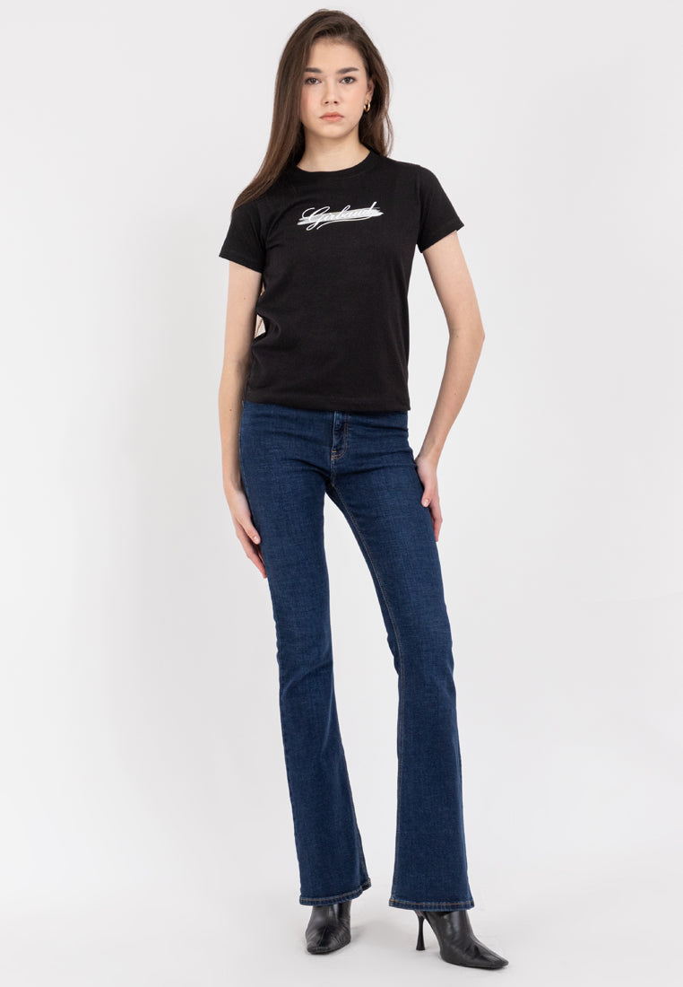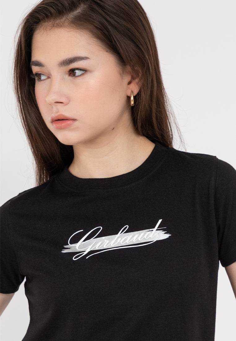 The Marithe Francois Girbaud Ladies G Metallic Tee features a classic crew neckline, a regular fit, and a contrast graphic script print for everyday streetwear style.