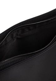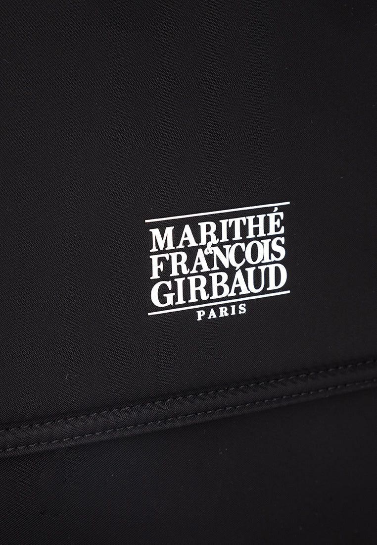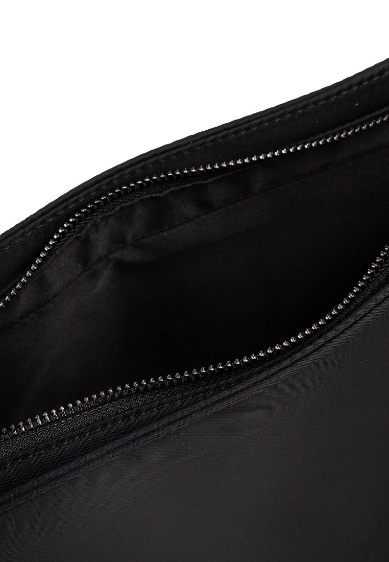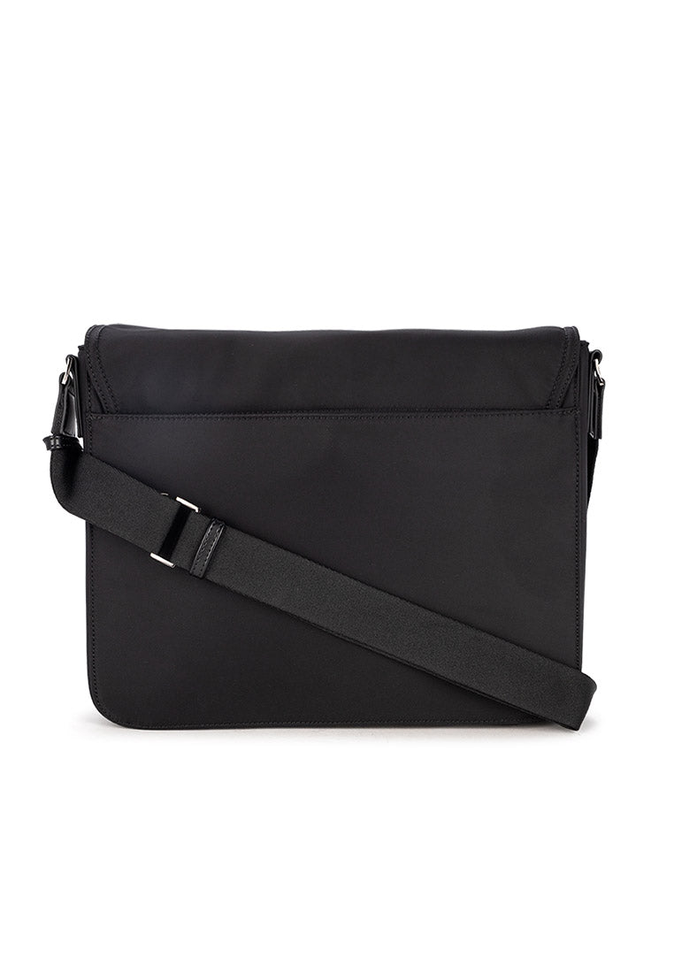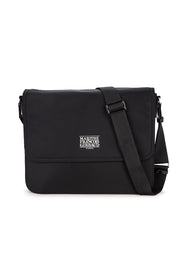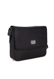 A Nylon messenger bag with zipper and embellished with an embossed gel print logo.