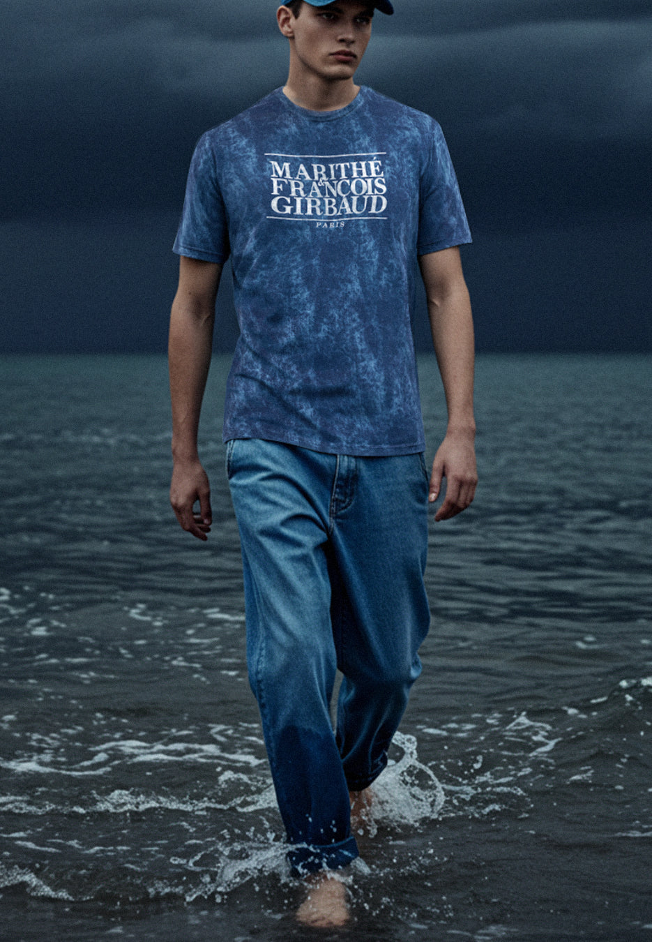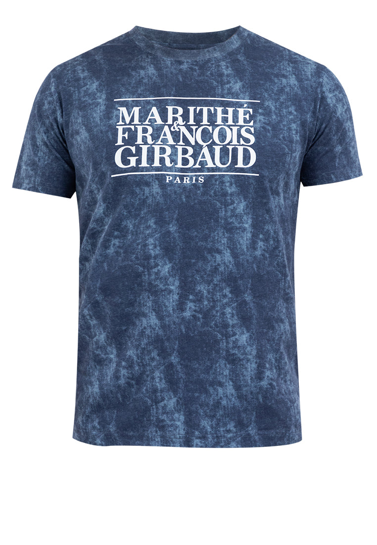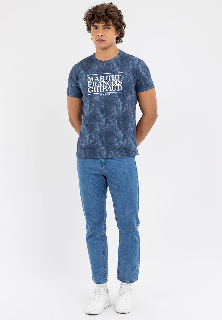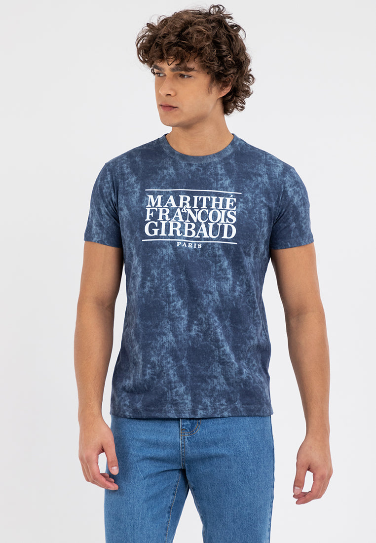 Expand your wardrobe rotation with Marithe Francois Girbaud's Men's OG Denim Print Logo Tee, featuring a branding graphic on its front paired with a denim-like motif for added appeal.
