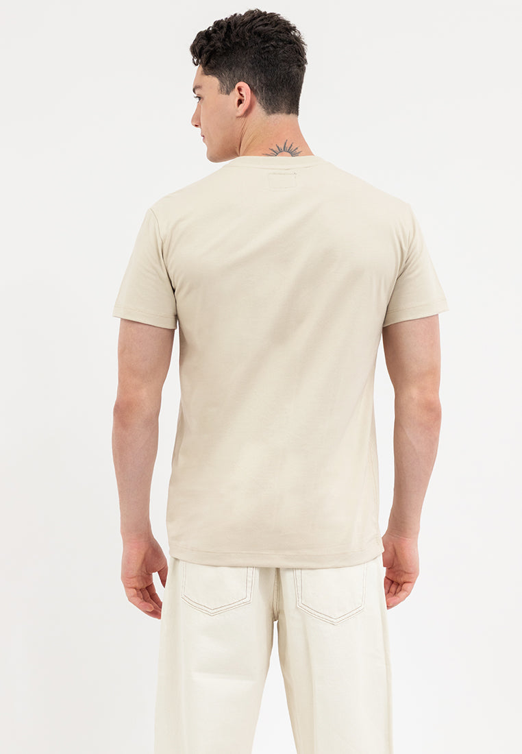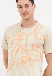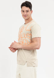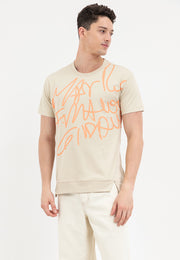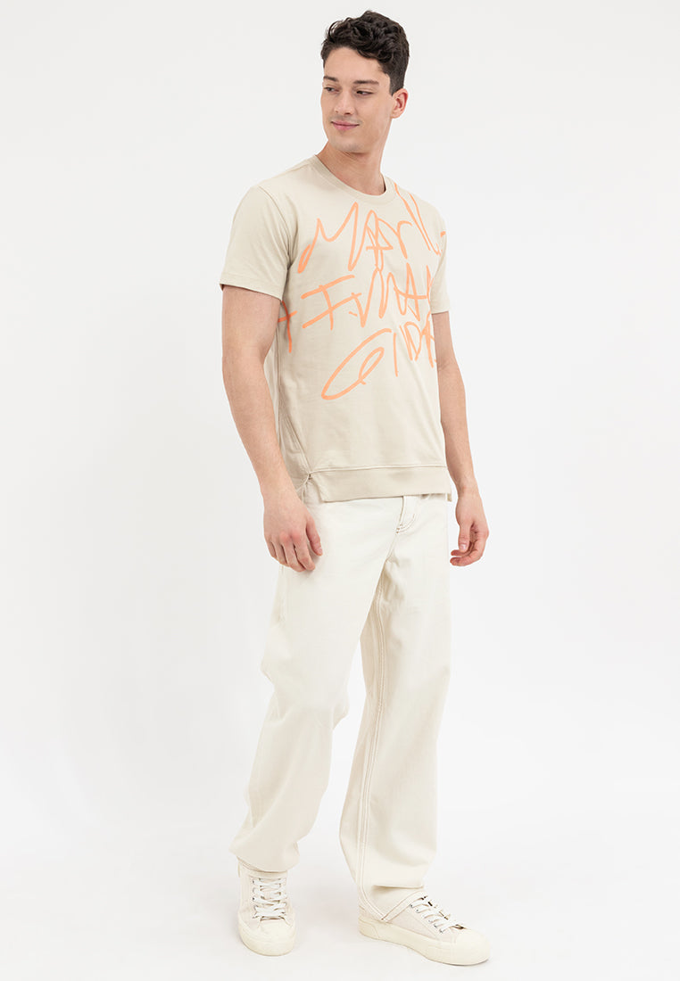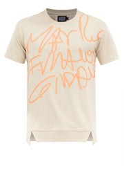 Infuse an elevated take on your wardrobe staple with Marithe + Francois Girbaud's Men's M+FG Beige Tee, featuring a large graffiti-inspired branding graphic on the front and a high-low hem for added twist.