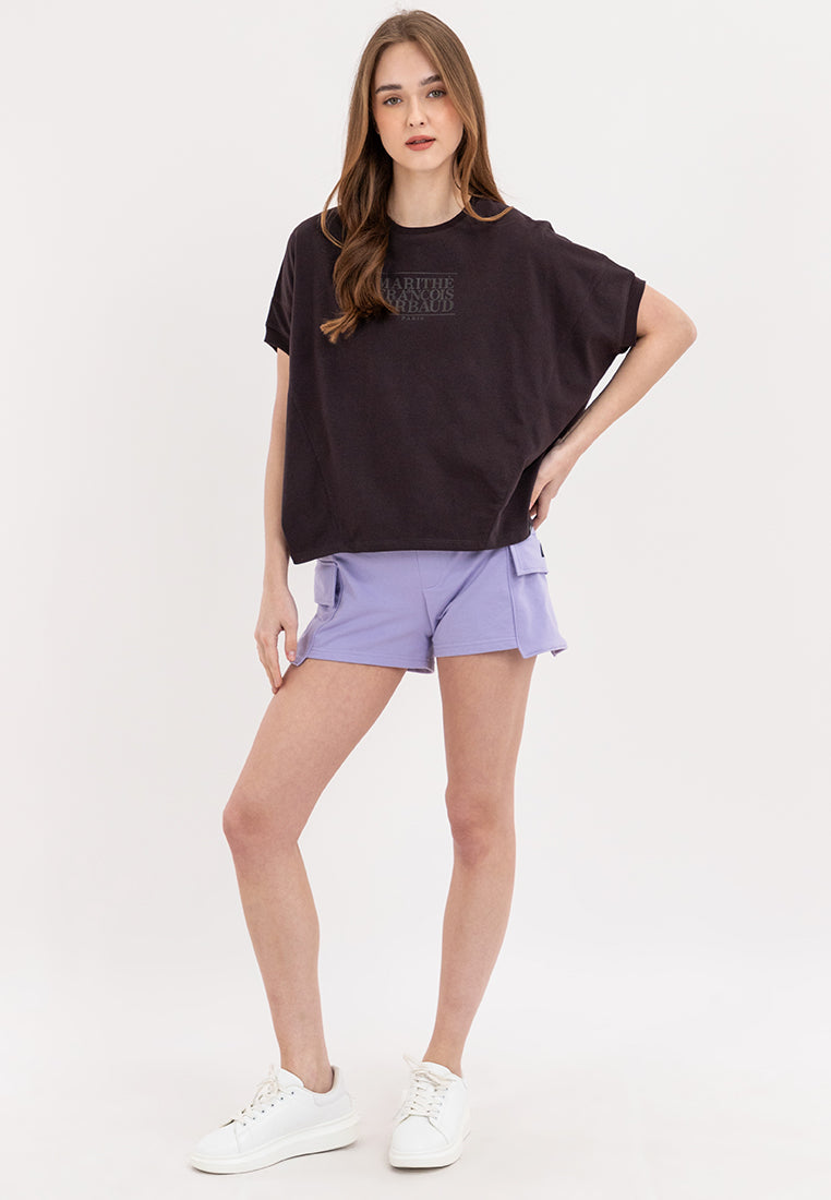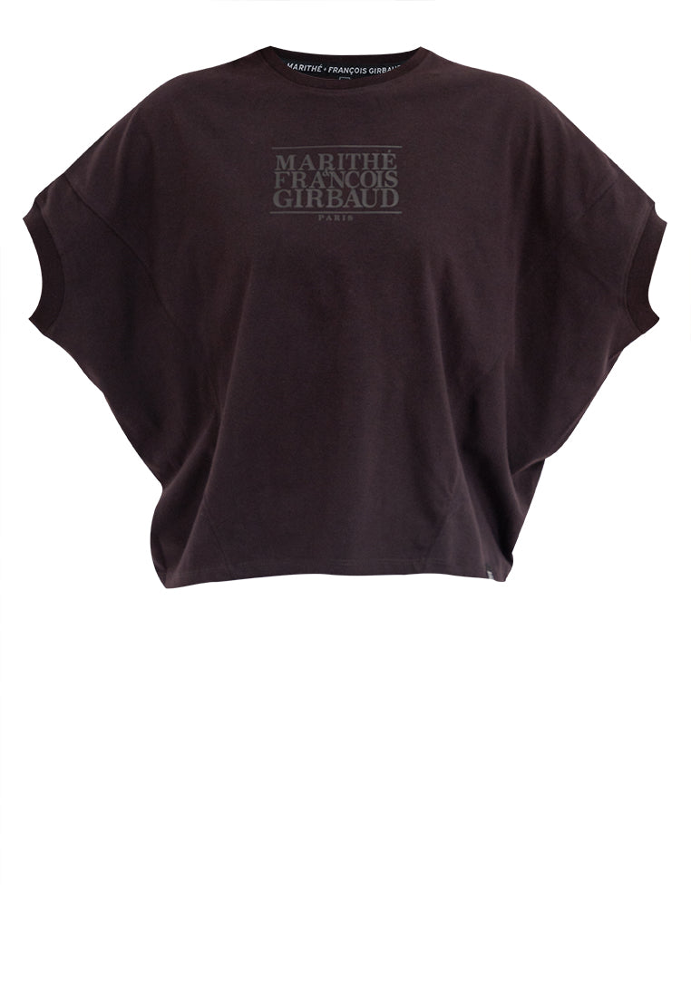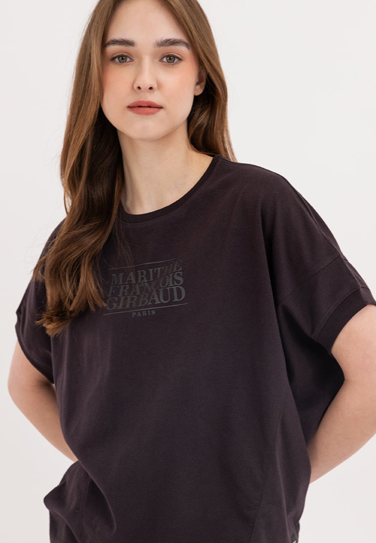 The Ladies Kyla Tee by Marithe Francois Girbaud features a round neck, bat sleeves, and a branded design for a casual and comfortable look.