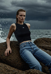 Ladies OG Halter Top from Marithe Francois Girbaud offers a cropped silhouette, designed with a crew neckline and sleeveless style for a chic casual look.